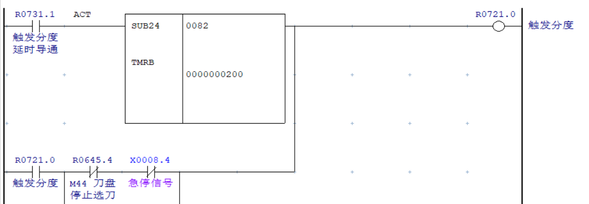 由于“自動(dòng)分度模式”需在伺服驅(qū)動(dòng)器在收到系統(tǒng)賦予的刀號(hào)后才能進(jìn)行尋刀切該模式需觸發(fā)0.2秒以上才能進(jìn)入,因此不能直接使用F7.3選刀信號(hào)進(jìn)行觸發(fā)而使用中間繼電器,且延遲0.2秒導(dǎo)通并進(jìn)行互鎖,確?!白詣?dòng)分度模式”可以正常觸發(fā)。刀盤選刀完成后導(dǎo)通SUB200功能指令進(jìn)行刀盤換刀位置刀套內(nèi)刀號(hào)與目標(biāo)刀號(hào)的比較,一致時(shí)輸出R733.4信號(hào)打斷“自動(dòng)分度模式” 互鎖,完成整個(gè)選刀過(guò)程。